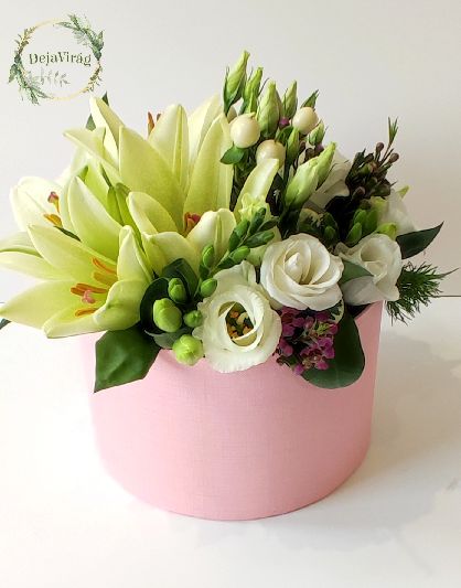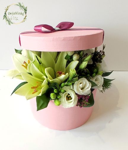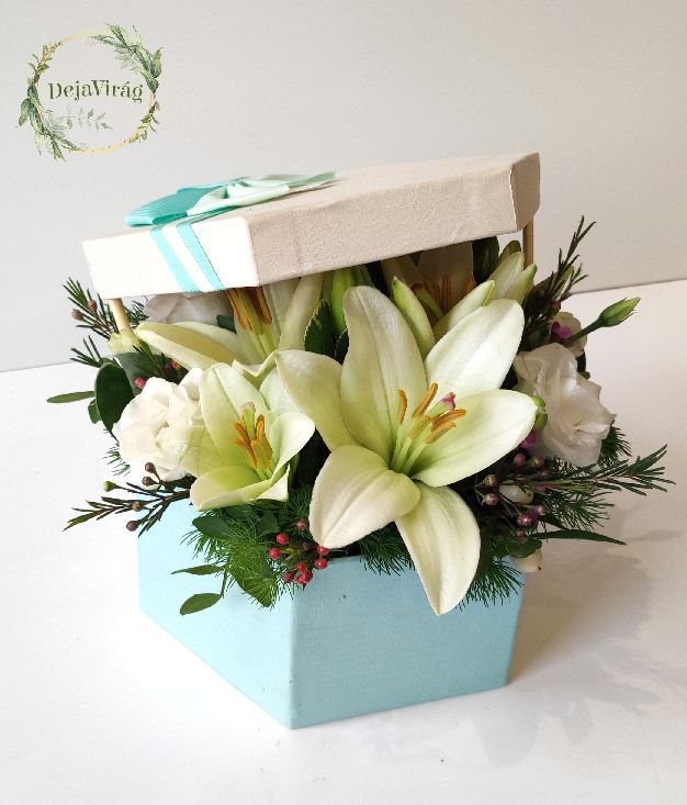 20×20 cm színekben változatos virág box amelyben vegyes virágok és liliom virág van.