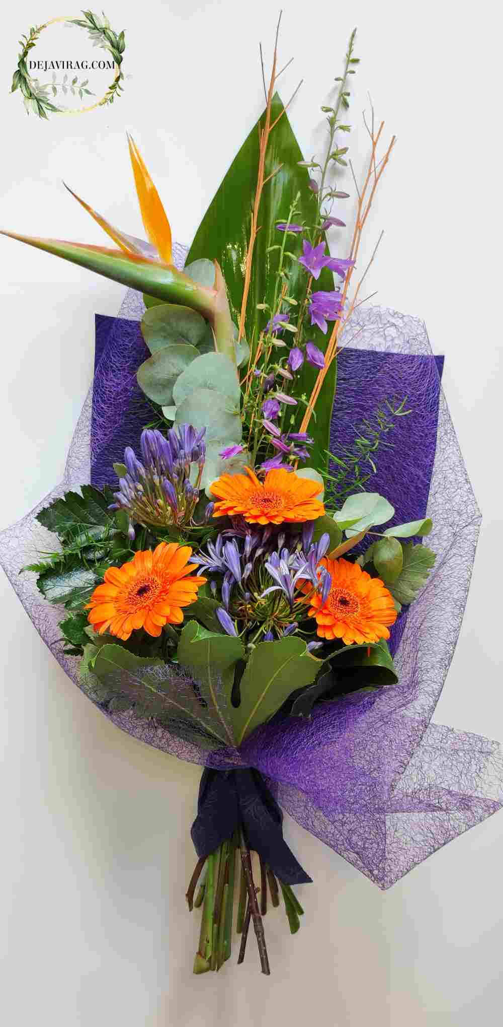 Papagájvirágos (Strelizia) nyújtott csokrunk egy kis egzotikus vegyes csokor amely bármely alkalomra kitűnő választás lehet, főként ballagások, anyák napja és születésnpokra kért csokor.