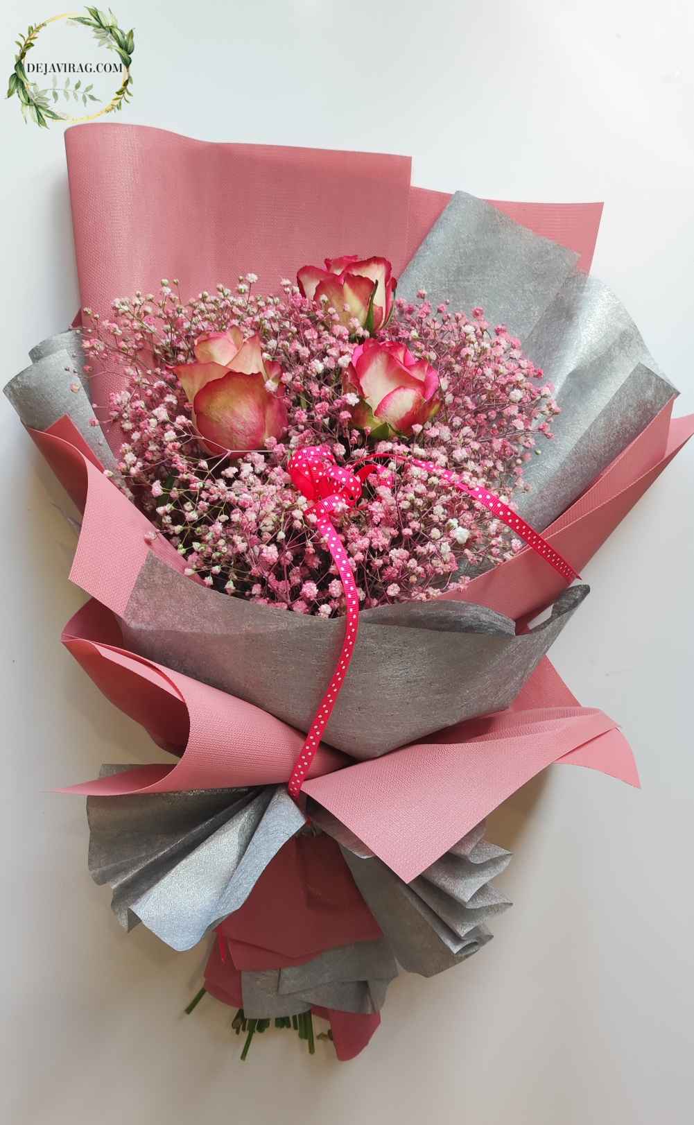 Színezett vagy igény szerint natur fehér rezgő 3 szál színben hozzá illő rózsával és extra díszpapír díszitéssel készítjük. Ezt a modern csokrot azoknak ajánljuk akik szeretik az újdonságokat.