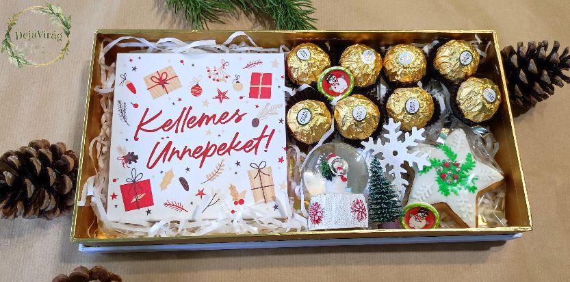 Ferrero Rocherrel tartalma: 8 db Ferrero Rocher golyó, Sweetic felíratos kézműves csoki, Mini 8cm hógömb, Mini fenyőfa 5cm, 1db Mézeskalács