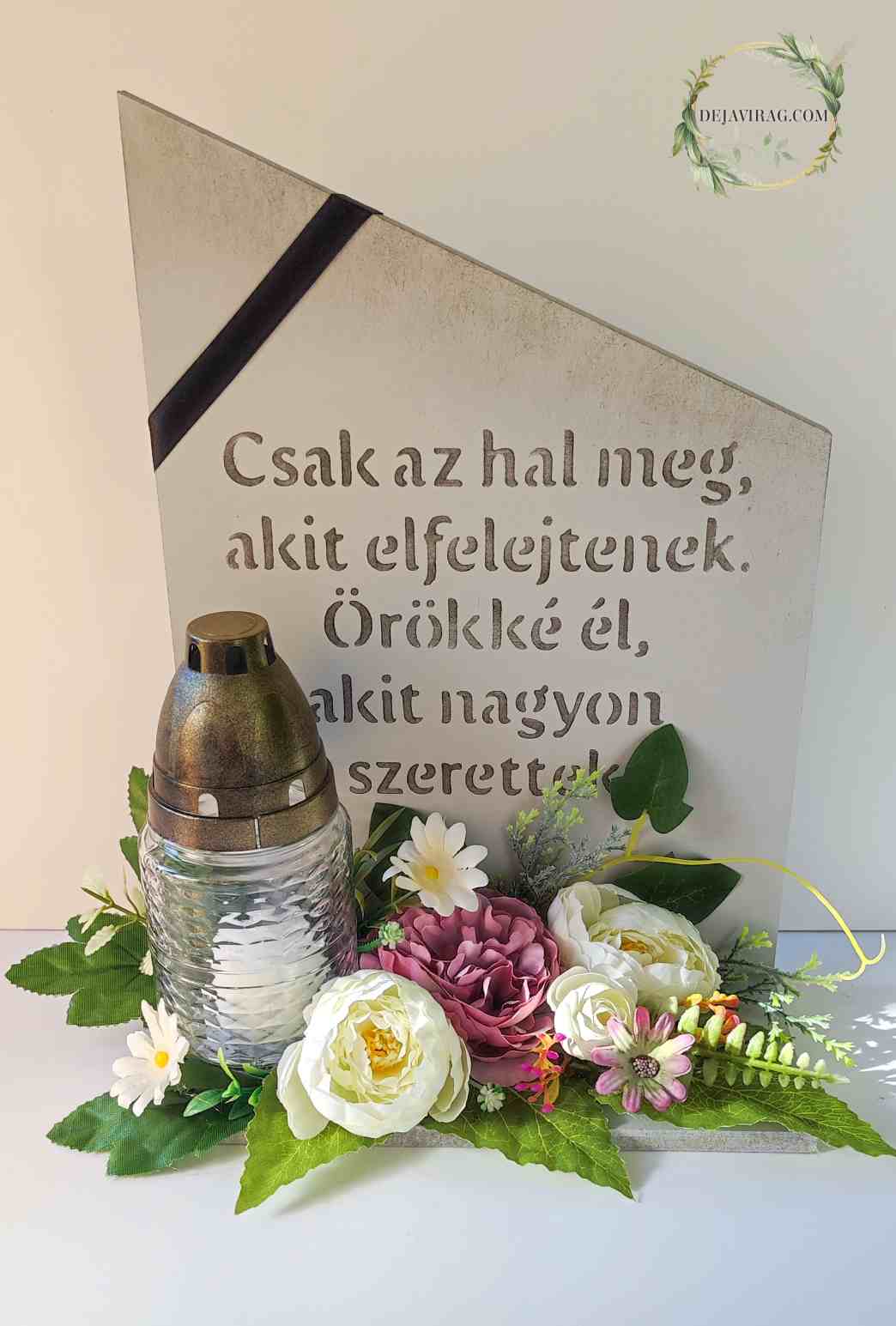 Fehér fa lapra írt üzenet a mennybe és díszitve minőségi sejemvirággal és mécsessel.