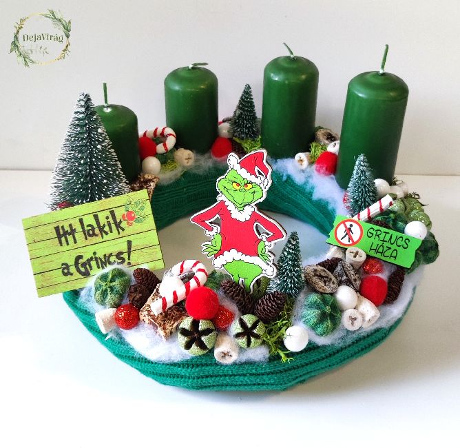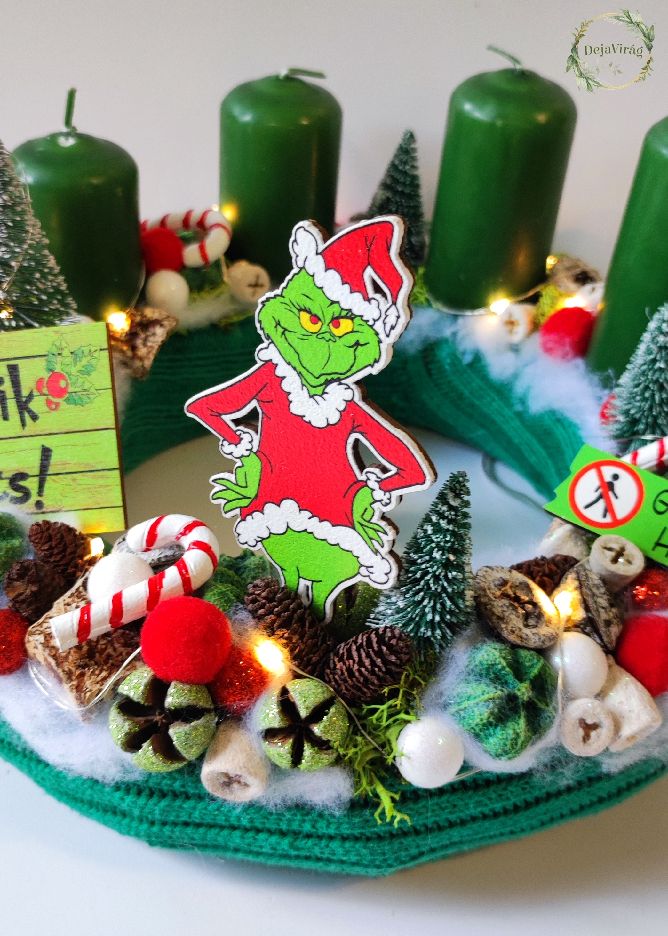 25 cm-es kötött alapra díszitett Grincses adventi koszorú led világítással.