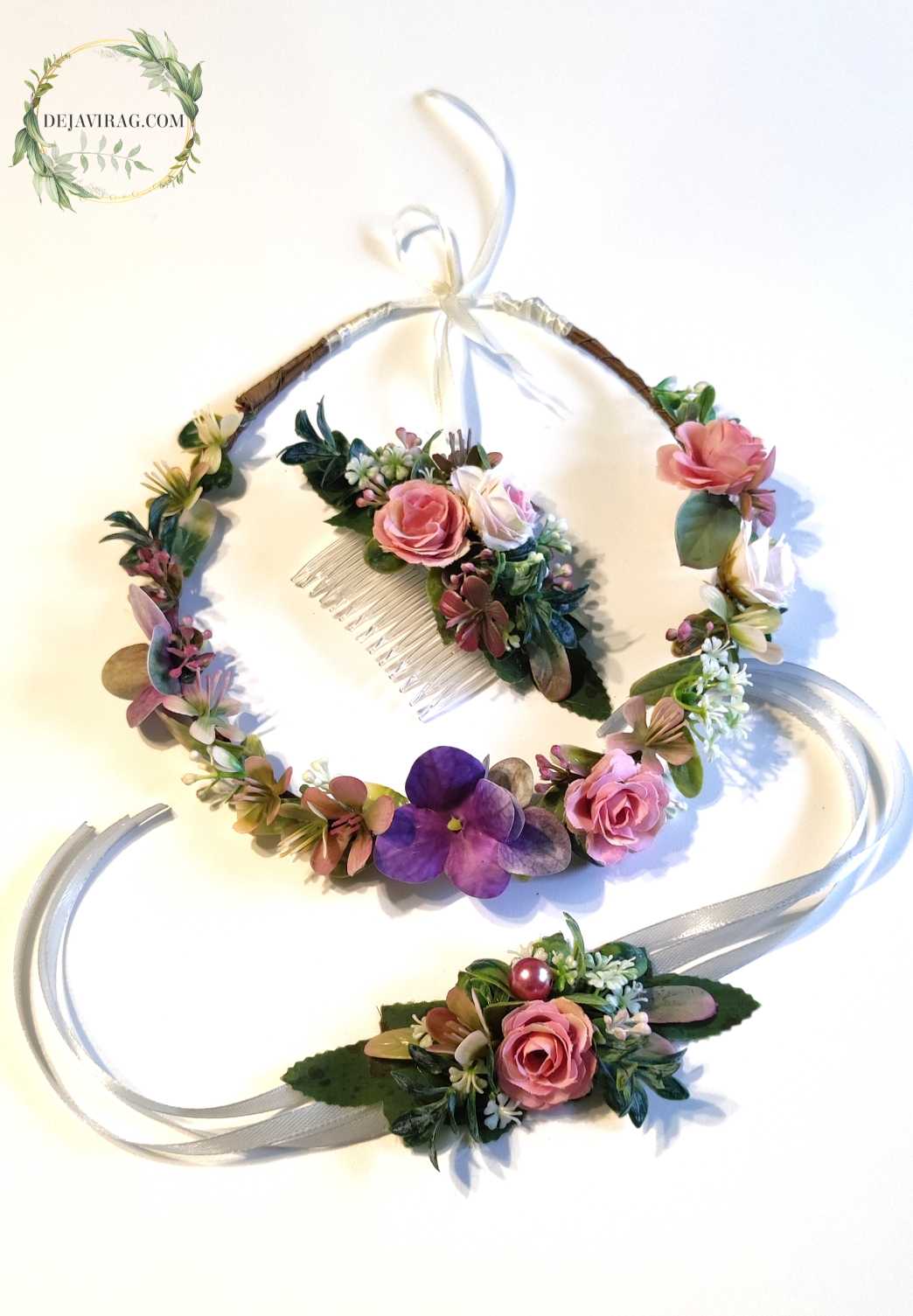 Minőségi sejem virágból készítjük ezt a csomagot amely tartalmaz egy füzért körbe díszitve , végén méretre formázást megkönnyítve egy szatán szalag kötést, tartalmaz még egy kar és fésűs hajdíszt amelyekkel teljes lehet a kép.