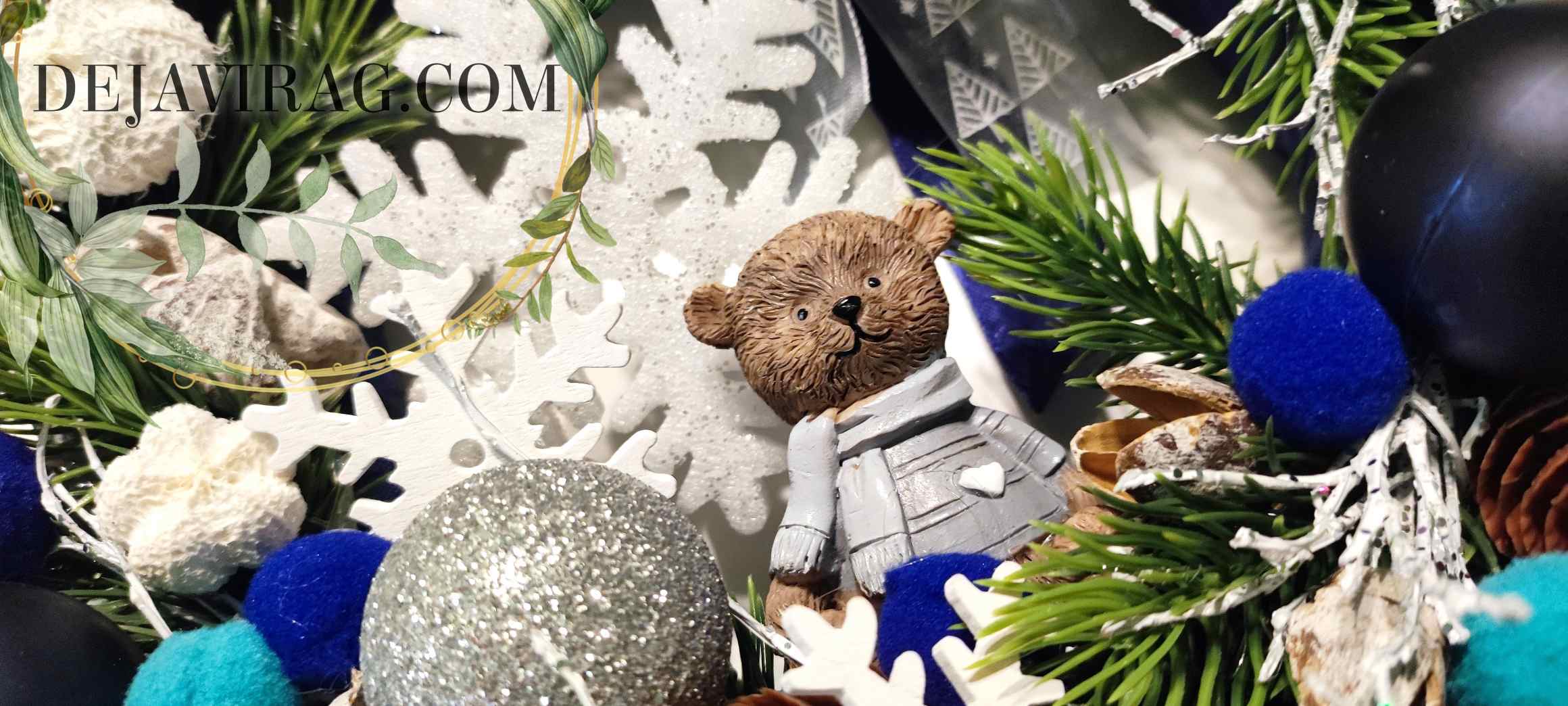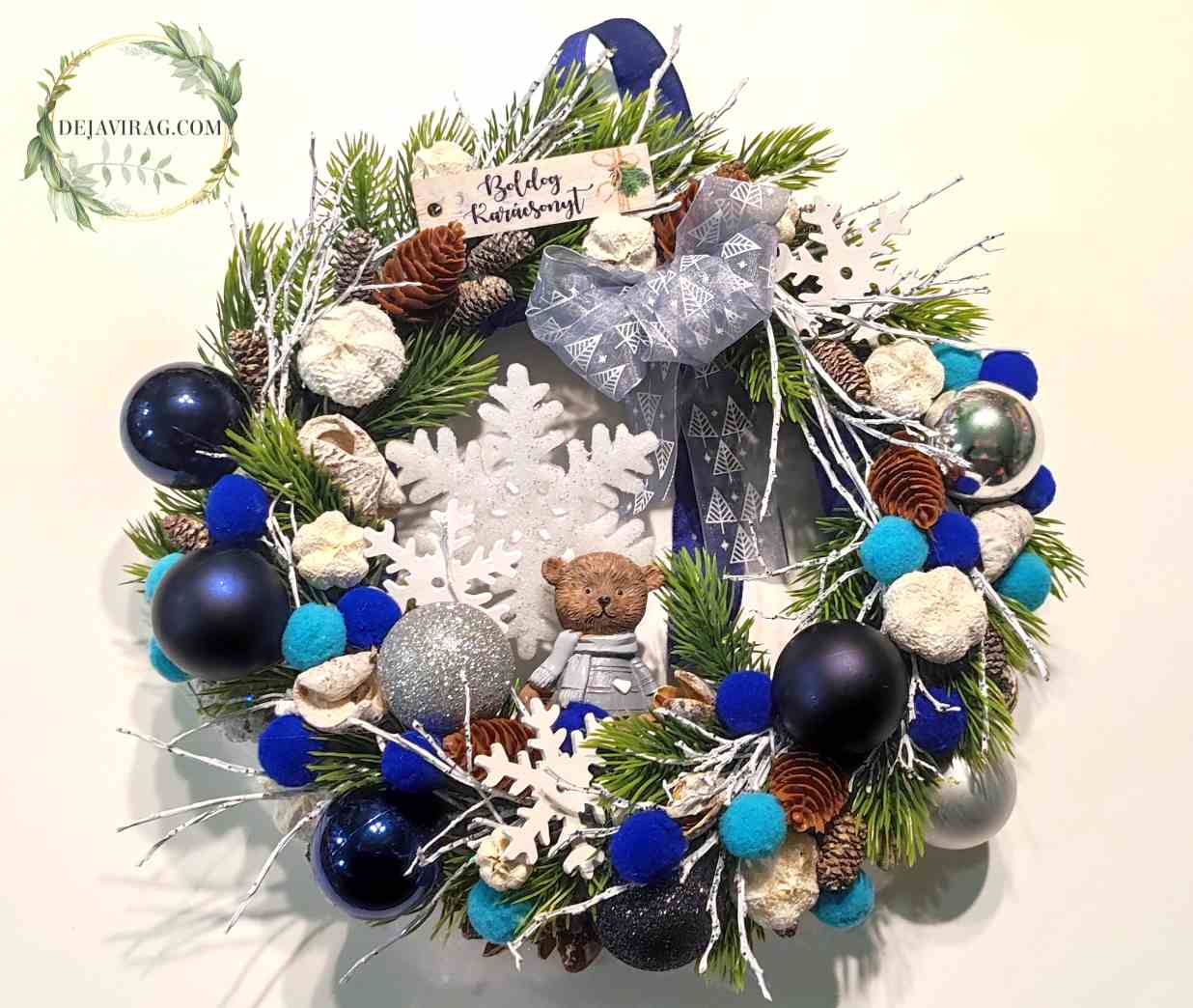 Kb. 25 cm műfenyő alapra épített cuki kerámia macis kopogtató, oriás hópihével és gömbökkel.