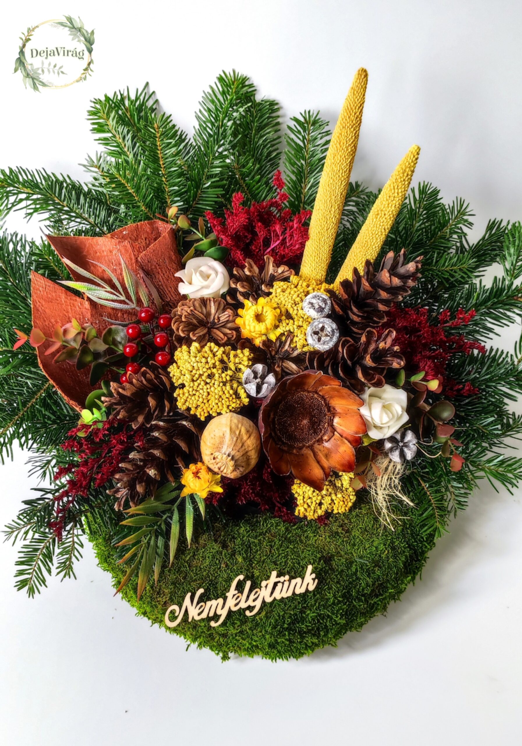 Főképp Mindenszentek és Halottak napján közkedvelt sír dísz, amely minőségi száraz virágok felhasználasával készül fenyőzve vagy fenyő nélkül, ahogy önnek jobban tetszik.