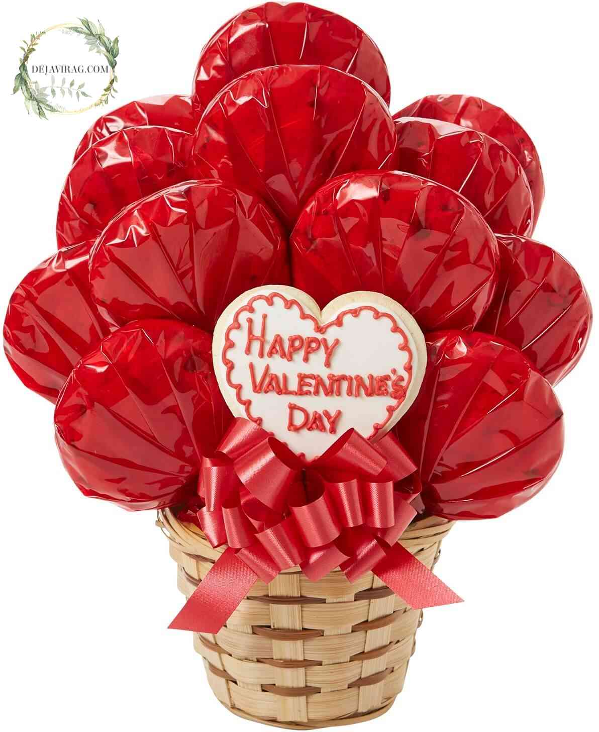 Finom, ropogós és csoki darabos kekszek egyesével csomagolva díszpapírba és kosárkába tűzve egy szív mézeskalács dísszel és masnival.