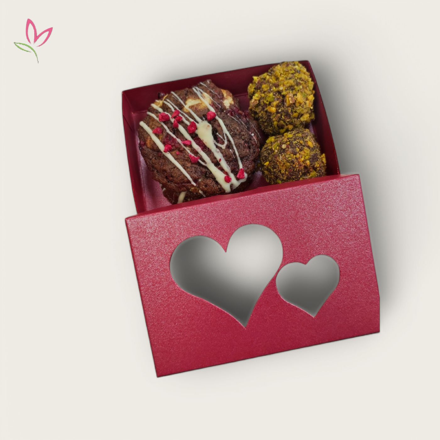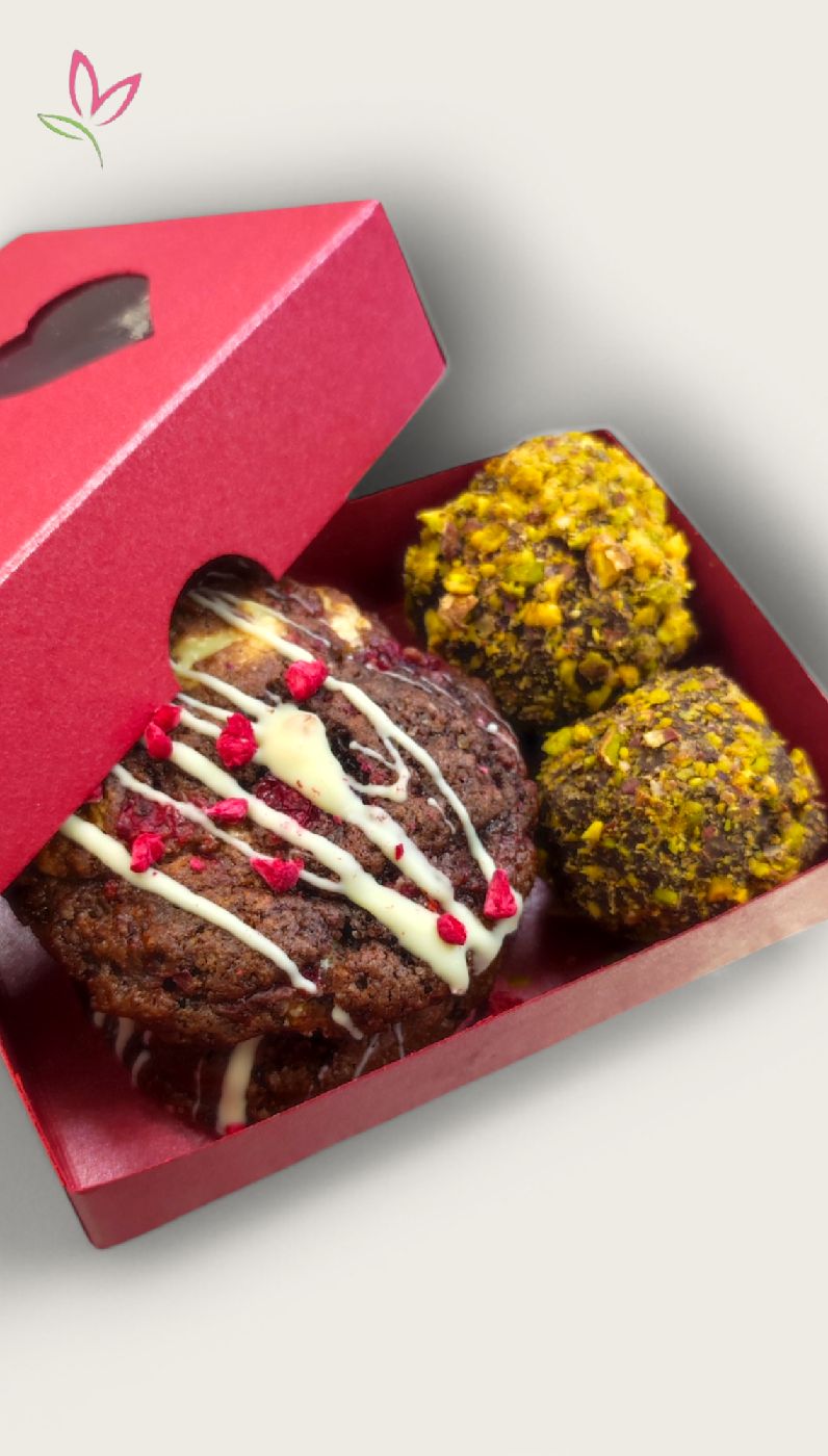 2 db Málnás-csokis keksz és 2db Dubai pisztáciás trüffel egy ellegáns dobozban.