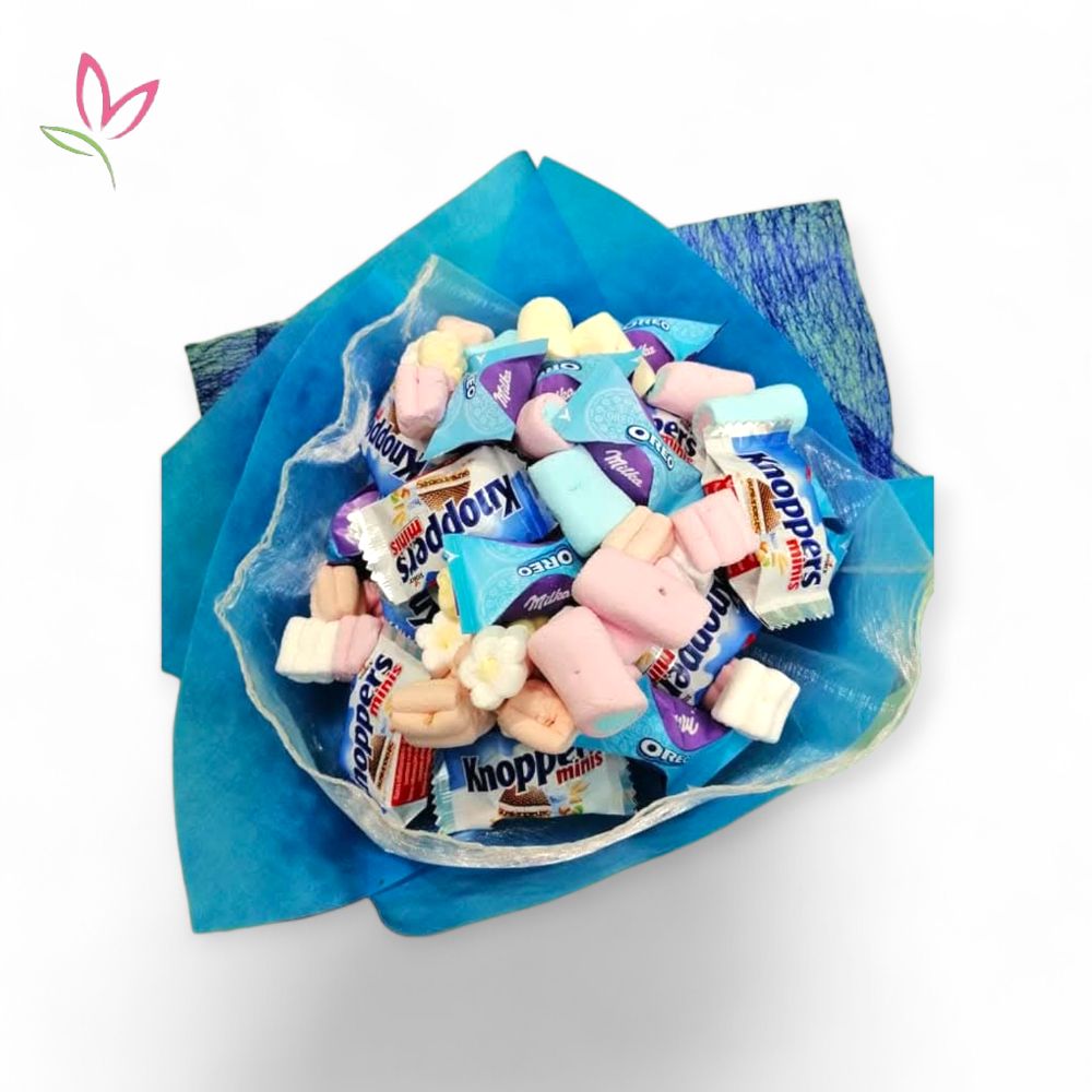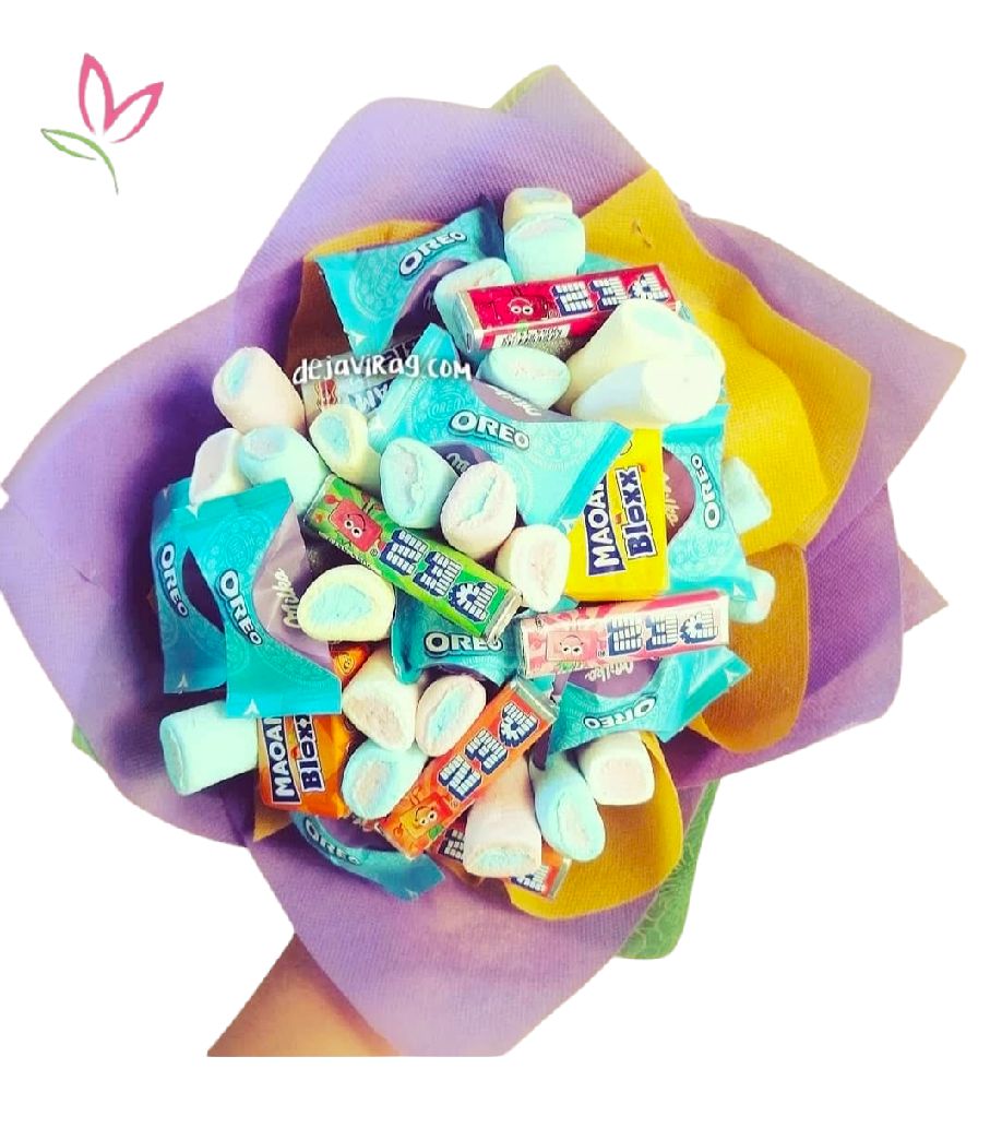 Vegyes finomságok banbusz pálcán csokorba kötve. 20-25-30 cm átmérőjü vegyes pillecukor,csoki, gumicukor alkotja.