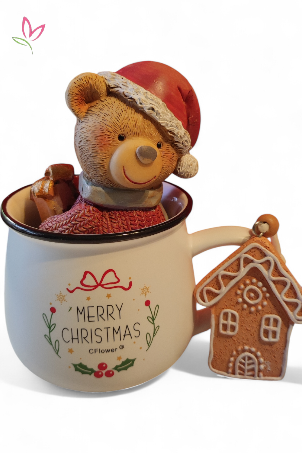 Tartalma egy Ferrero Rocher T16 200g csokoládé, édes kis mikulás sapkás Kerámia maci, Mézeskalács házikó fenyőfa dísz és egy Karácsonyi kávés vagy forrócsokis csészike. Mindez egy ízléses és elegáns karácsonyi díszdobozban.