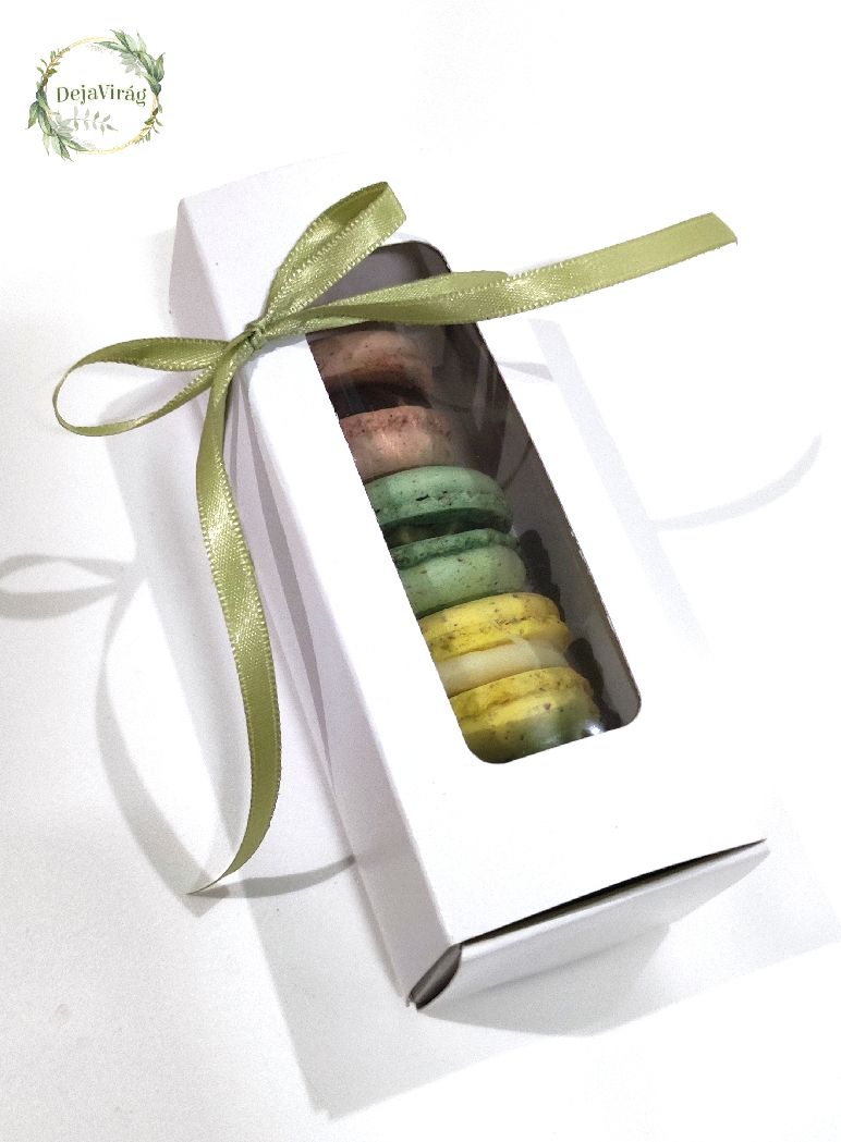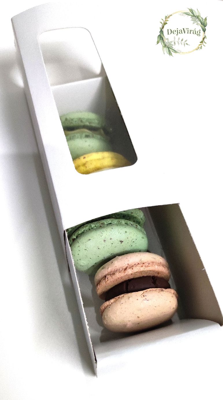 4 db macaron süti vegyes ízben egy díszdobozban remek kiegészítő egy csodás csokor vagy virág box mellé.