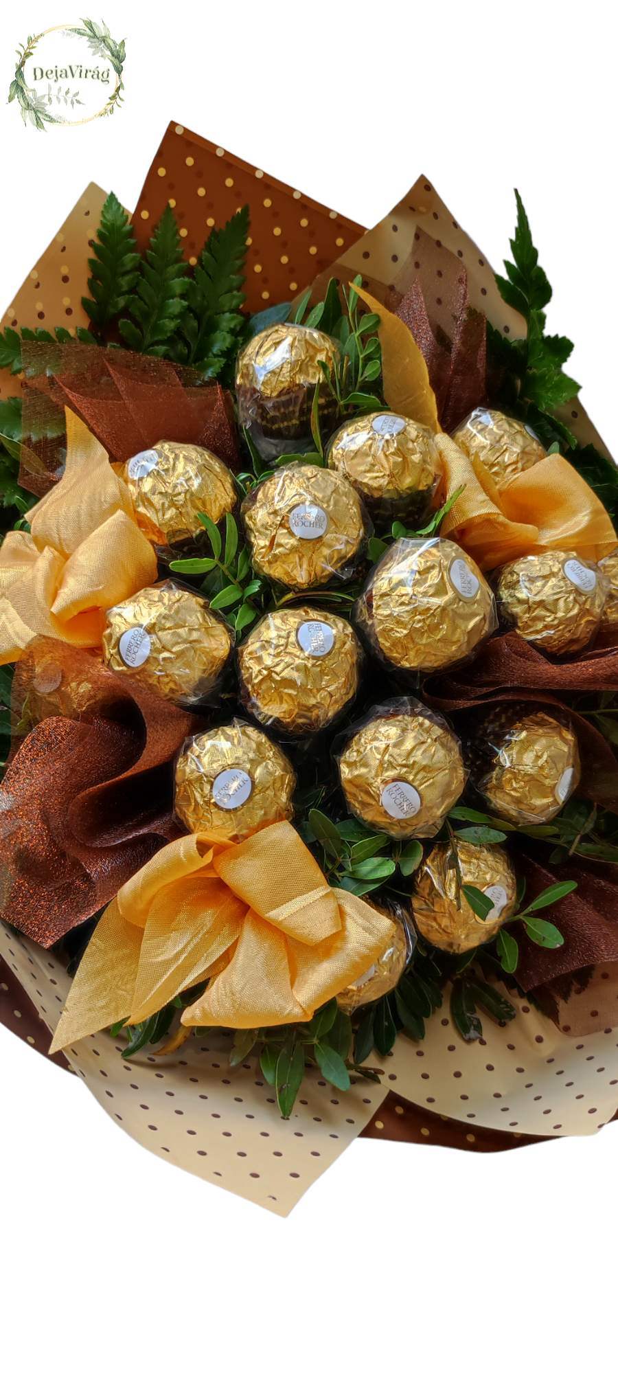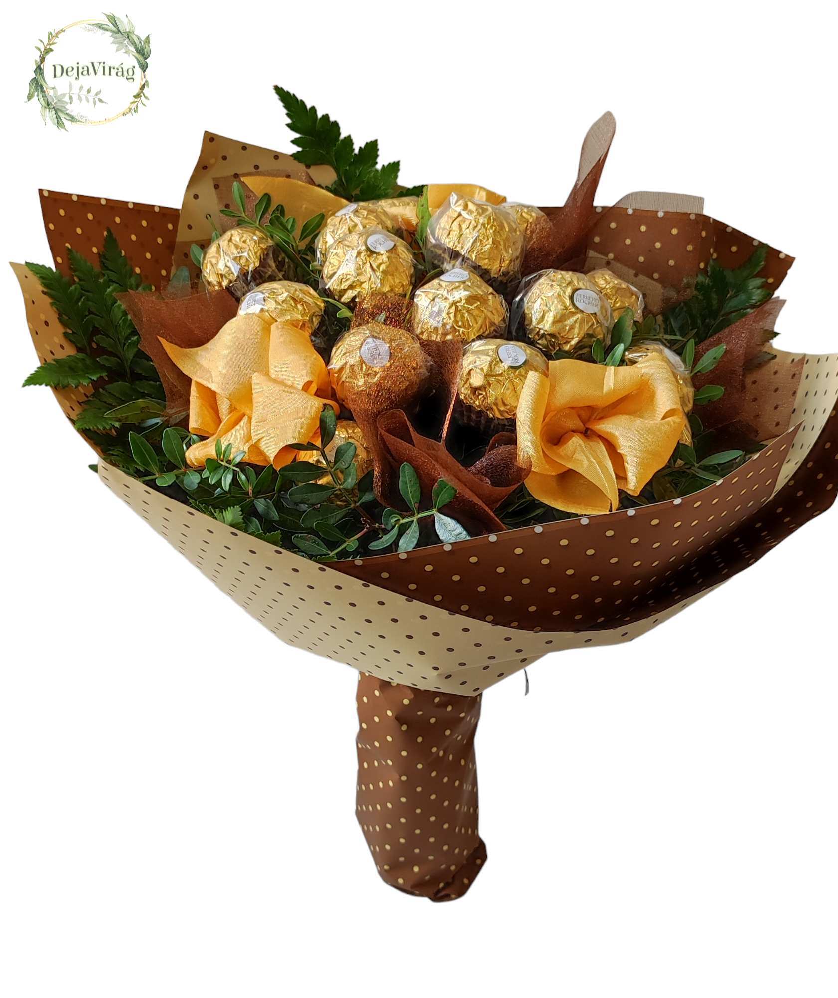 200 gramm/ 16 db Ferrero rocher csokoládé élő zöldekkel csokorba kötve, fincsi meglepetés.