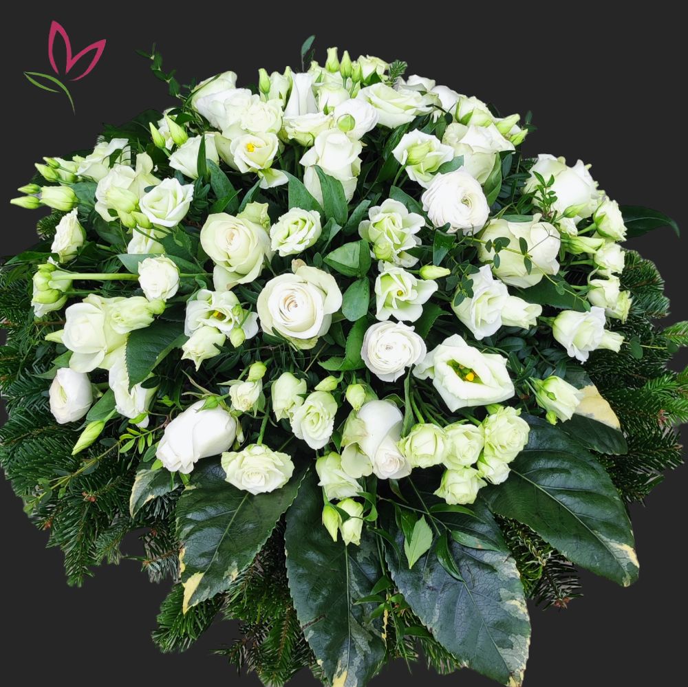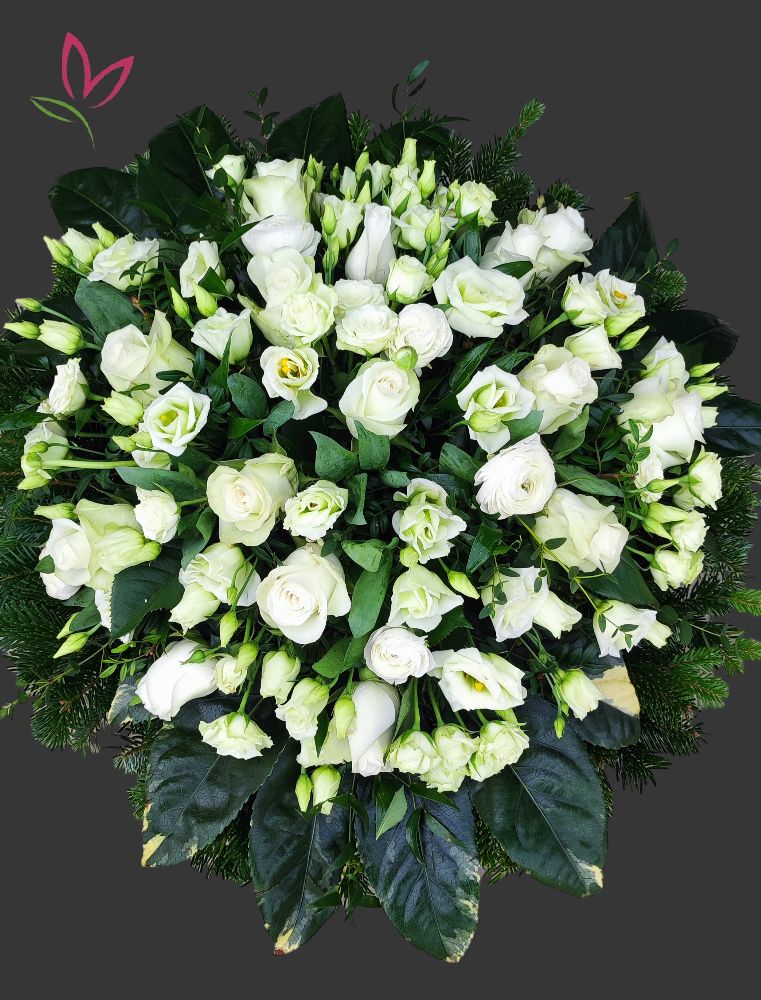 Rózsák és liziantusz virágzat alkotta kerek domb koszorú az égi szerettünk emlékére és fájó búcsú méltó megjelenésére.
