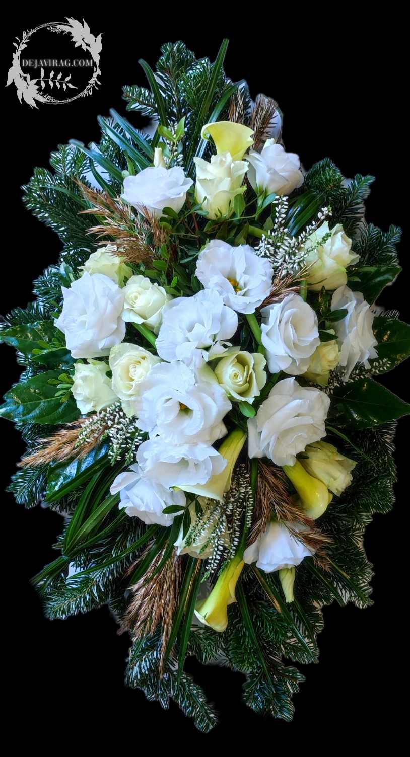 Oázis alapba tűzdelt fenyős sírdísz lizianthuszal és szezonális vegyes virággal. Ideális megemlékezésre sírcsokorként vagy koporsó dísznek.