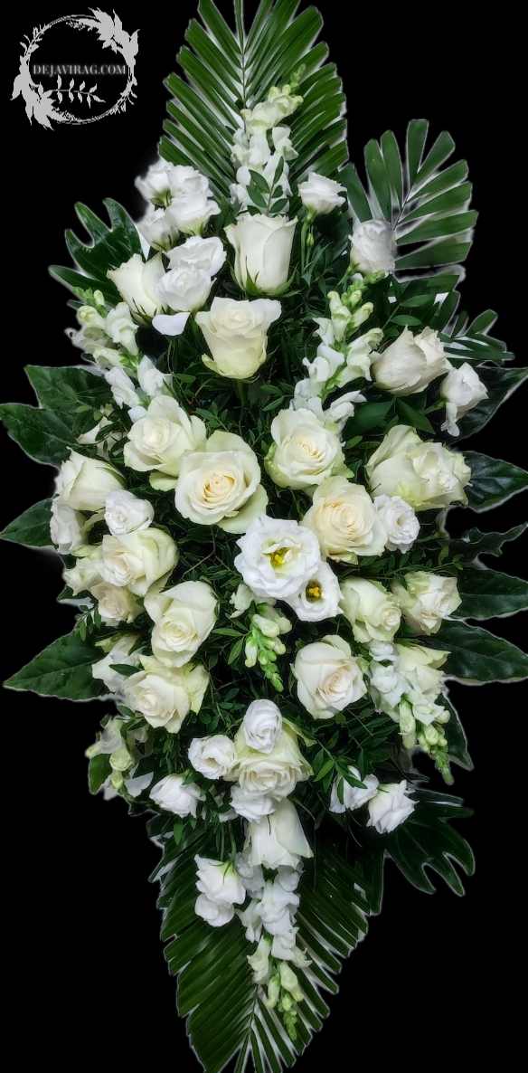 Oázis alapba tűzdelt fenyős alap rózsával és lizianthuszal. Ideális megemlékezésre sírcsokorként vagy koporsó dísznek.