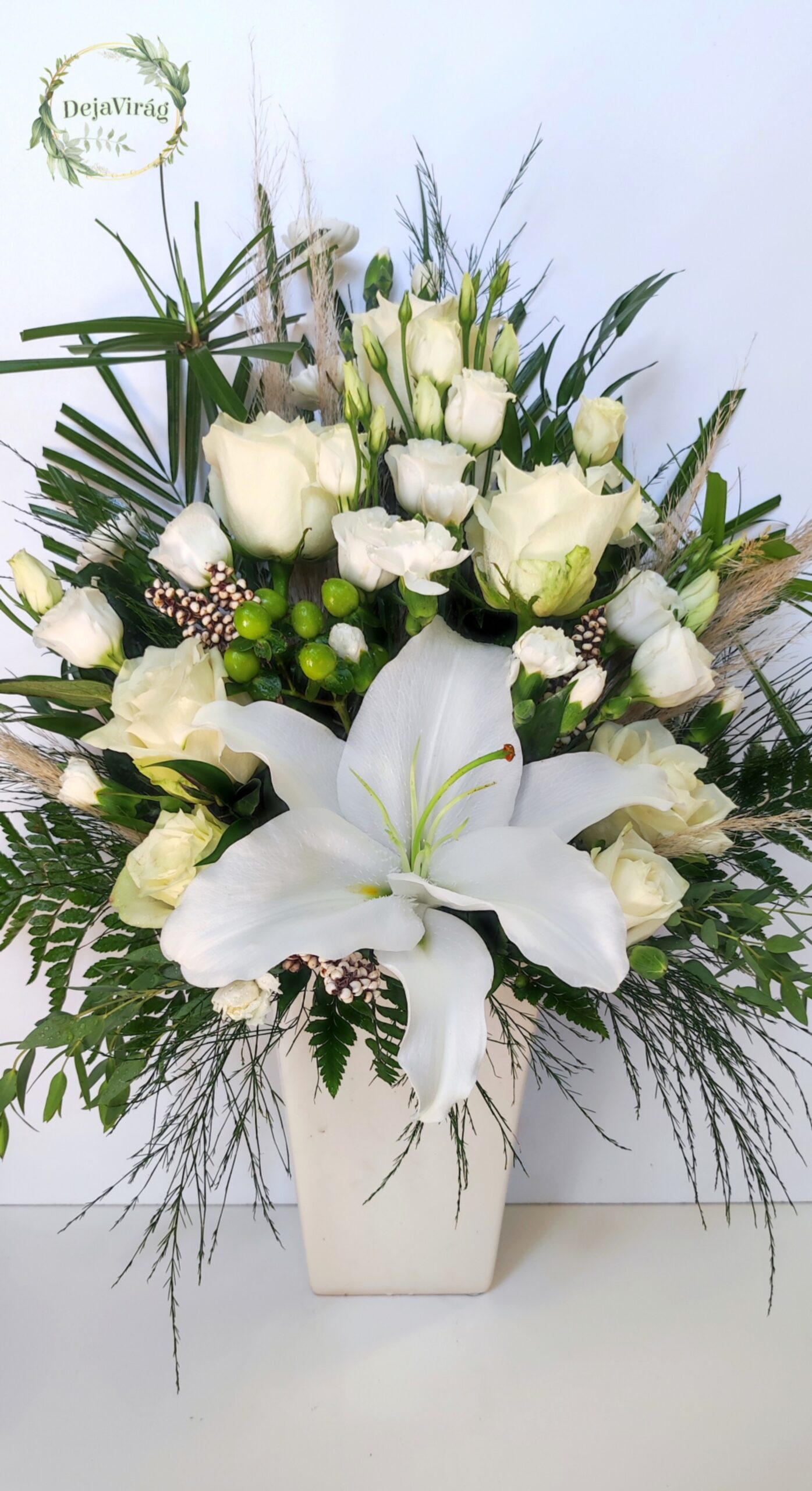 Kerámia vázába tűzdelt rózsák, lizianthuszok és liliom alkotta pompás virág tál.