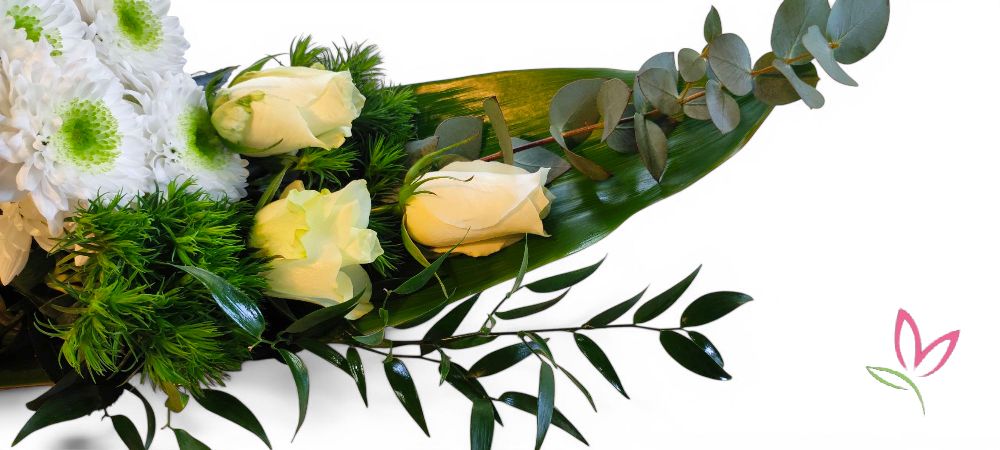 Cordiline csónak alakú nagy levélre természetesen lebomló anyagok segítségével készült 6 rózsa, krizantém és 4 szál egyéb szezonális fehér virág alkotta úszó levél koszorú, vízi temetési megemlékezésre.