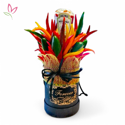 A kicsi 18,5 cm átmérőjű a nagy 36 cm díszdobozba tűzdelt vállogatott minőségű chili paprika színkavalkádja + egy tubus incsiklandozó chili szósszal.