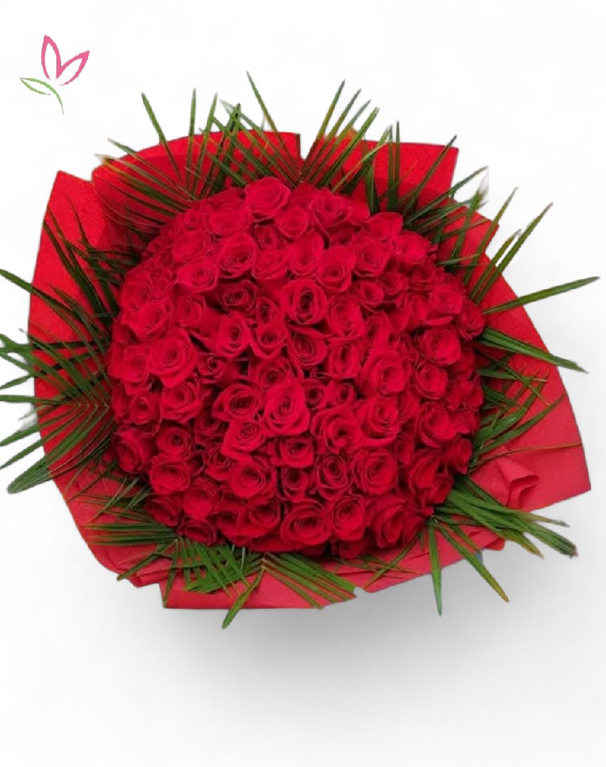 Száz szál gyönyörű és friss rózsa, csokorba kötve a szerelem és a luxus.