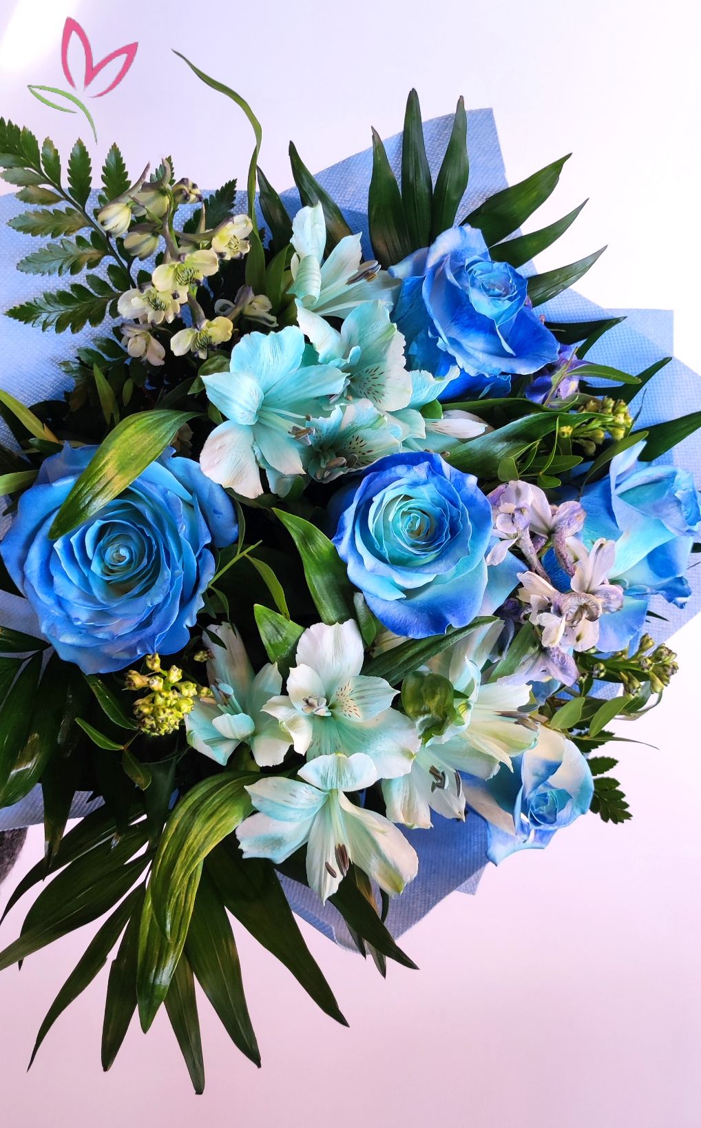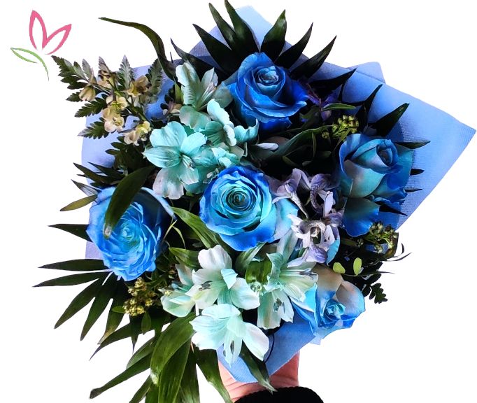 A kék égbolt színeiben vállogatott szép virágok, amelyek vagy eredetileg vagy virág festék segítségével kék színben kerek csokorba kötve rabolja el a szívet.