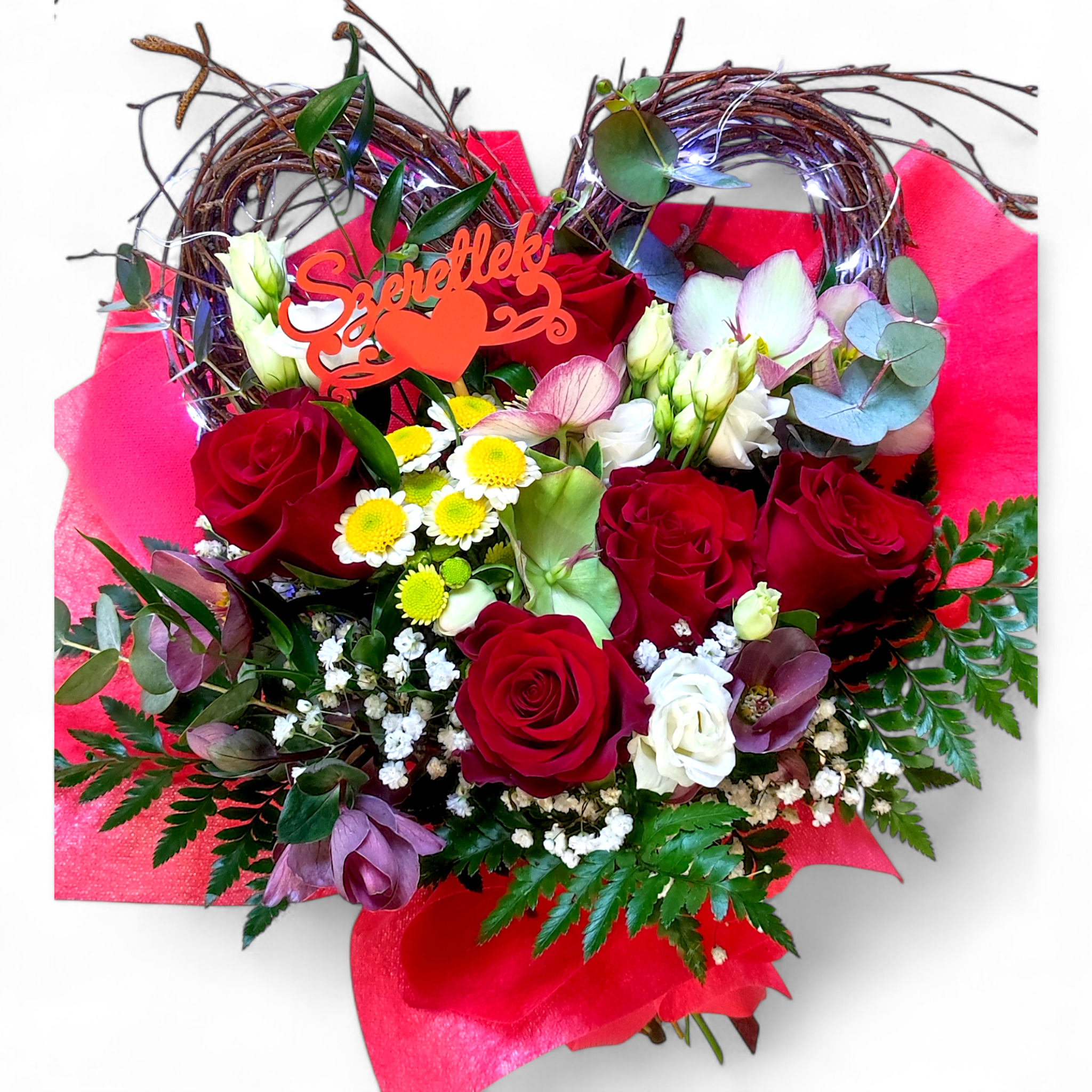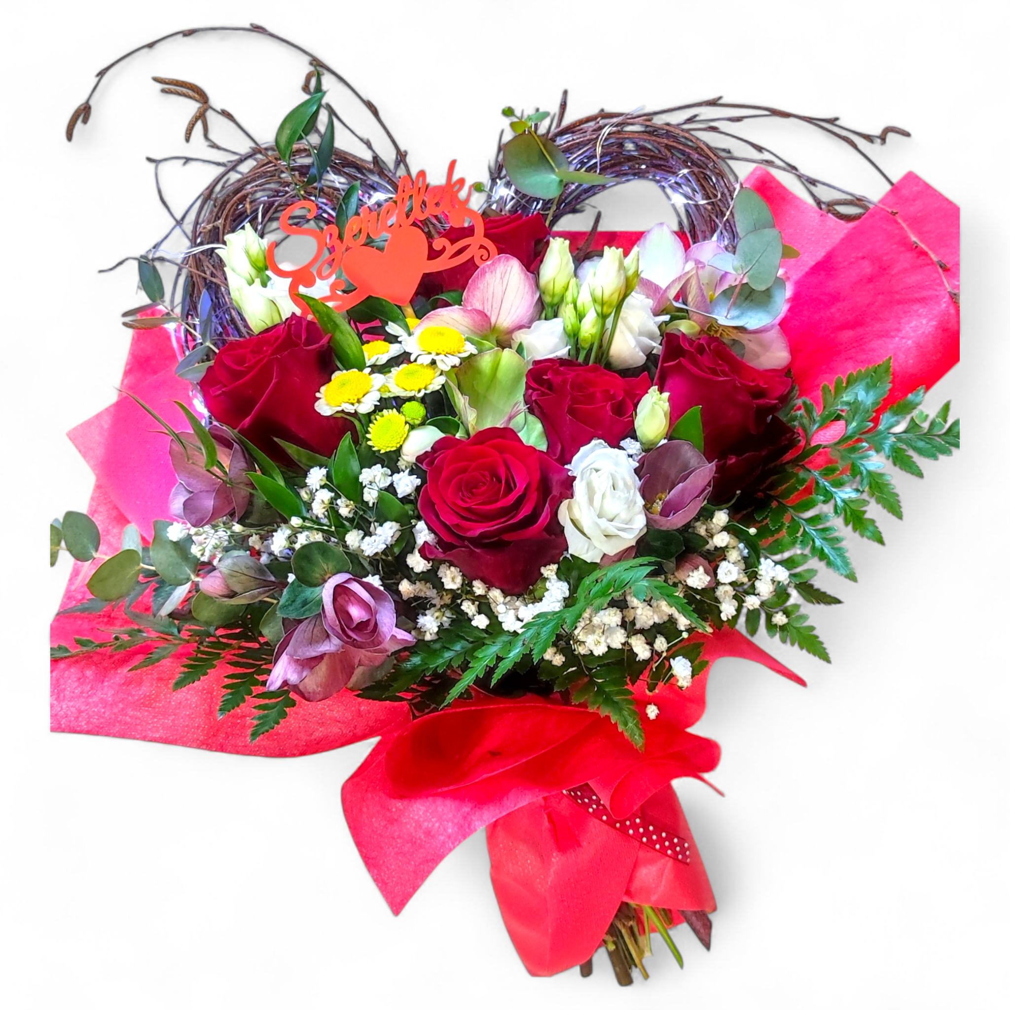 Kézzel készített szív formára hajtott ágak, romantikus csokor készítménye, 5 szál rózsával és egyéb kiegészítő virágokkal.