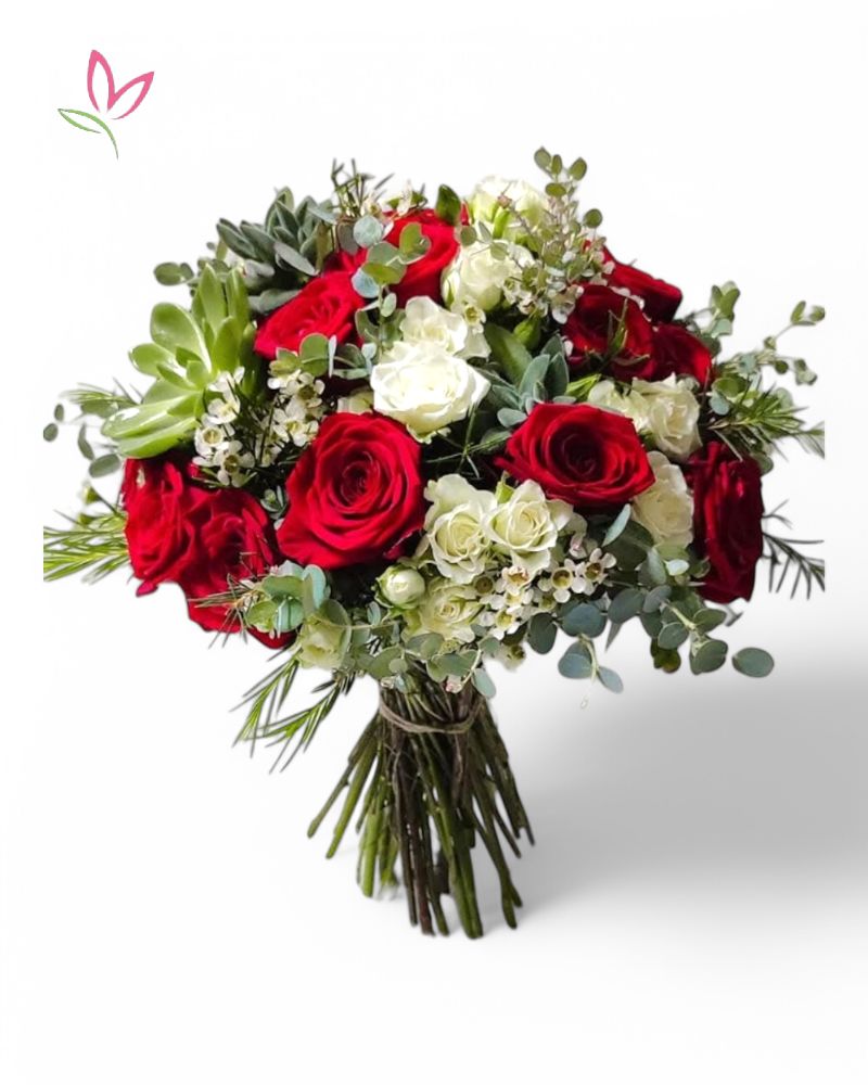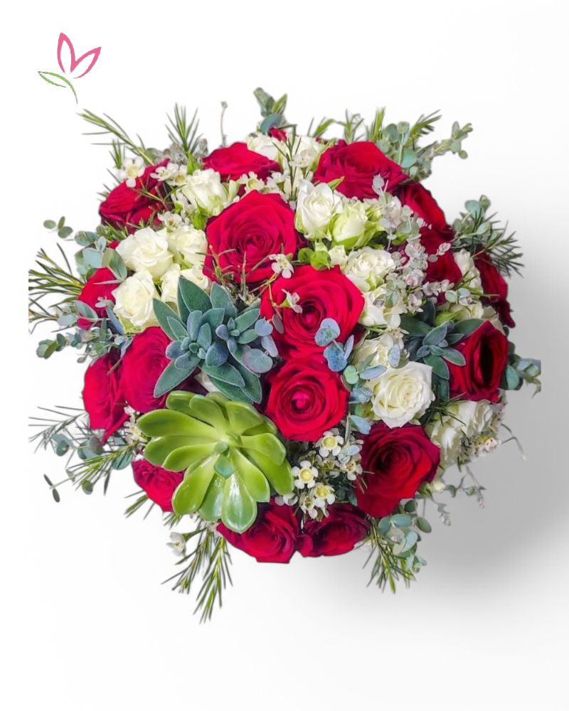 25 szálas vörös, fehér csoportos rózsa egy kis pozsgás szépségek kiegészítésével készült kerek csokor.
