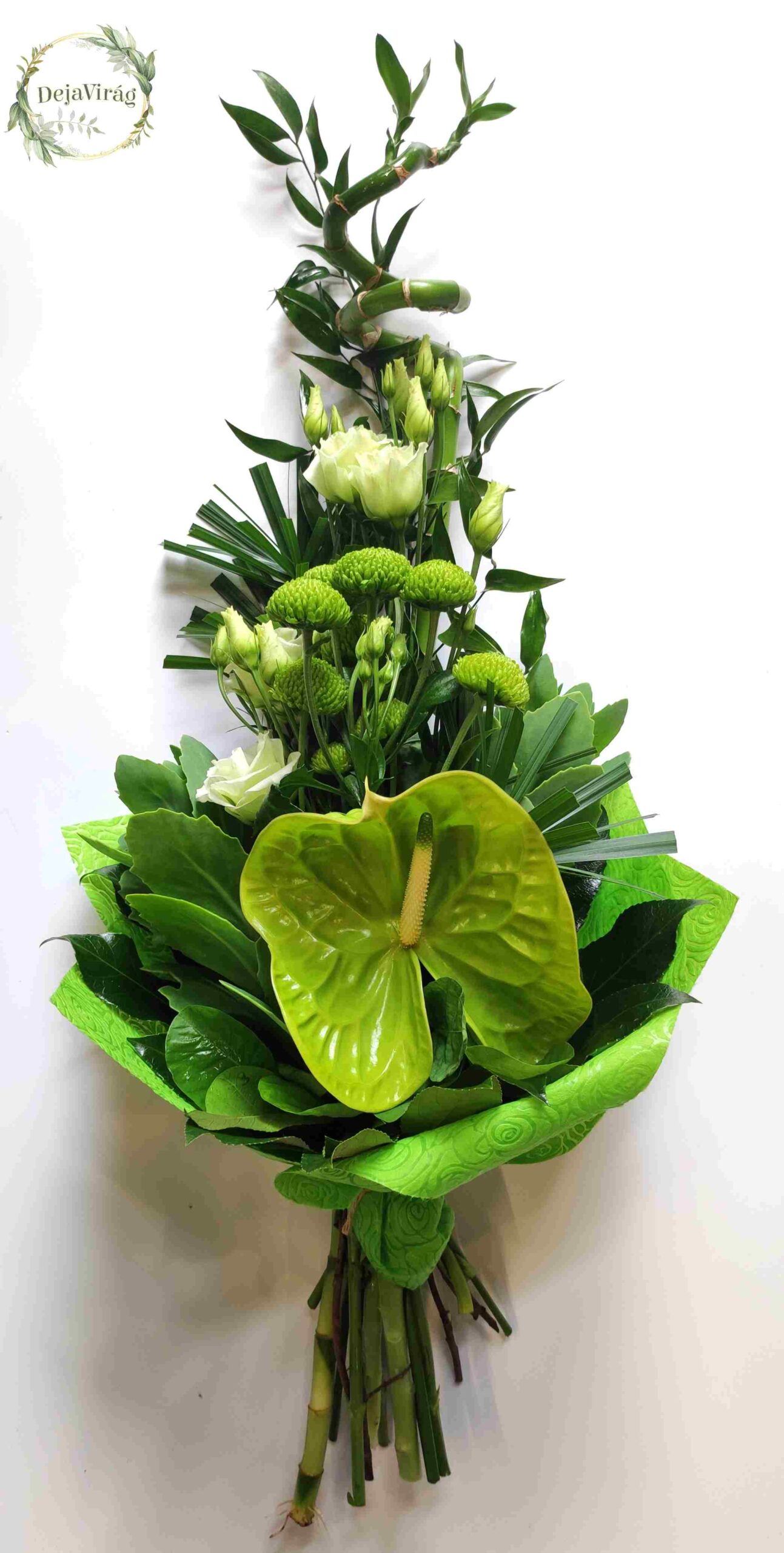 Csupa zöld színek a természet barátainak, fiúknak-lányoknak. Szerncsehozó bambusz, liziantusz, krizi és flamingó virág alkotta nyújtott csokor.