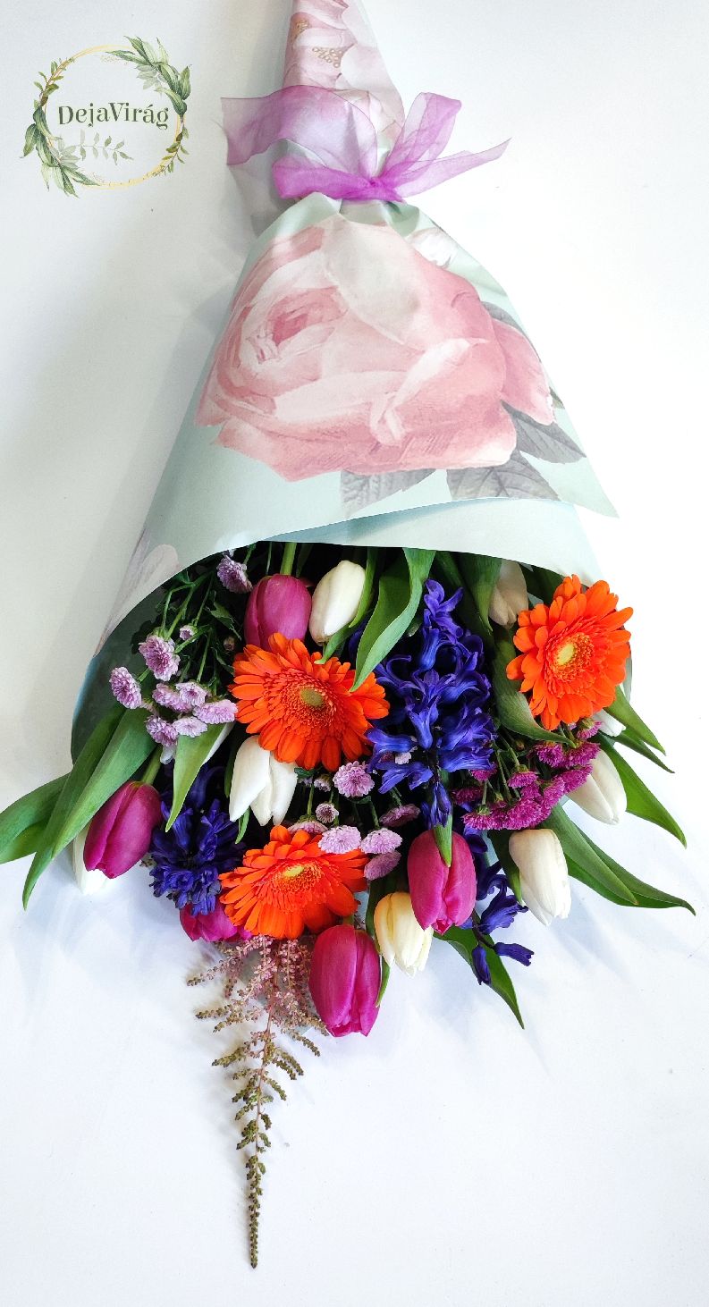 Vegyes színekben és fajtákban összevállogatott tavaszi virágok szálanként egy díszpapírba csomagolva.