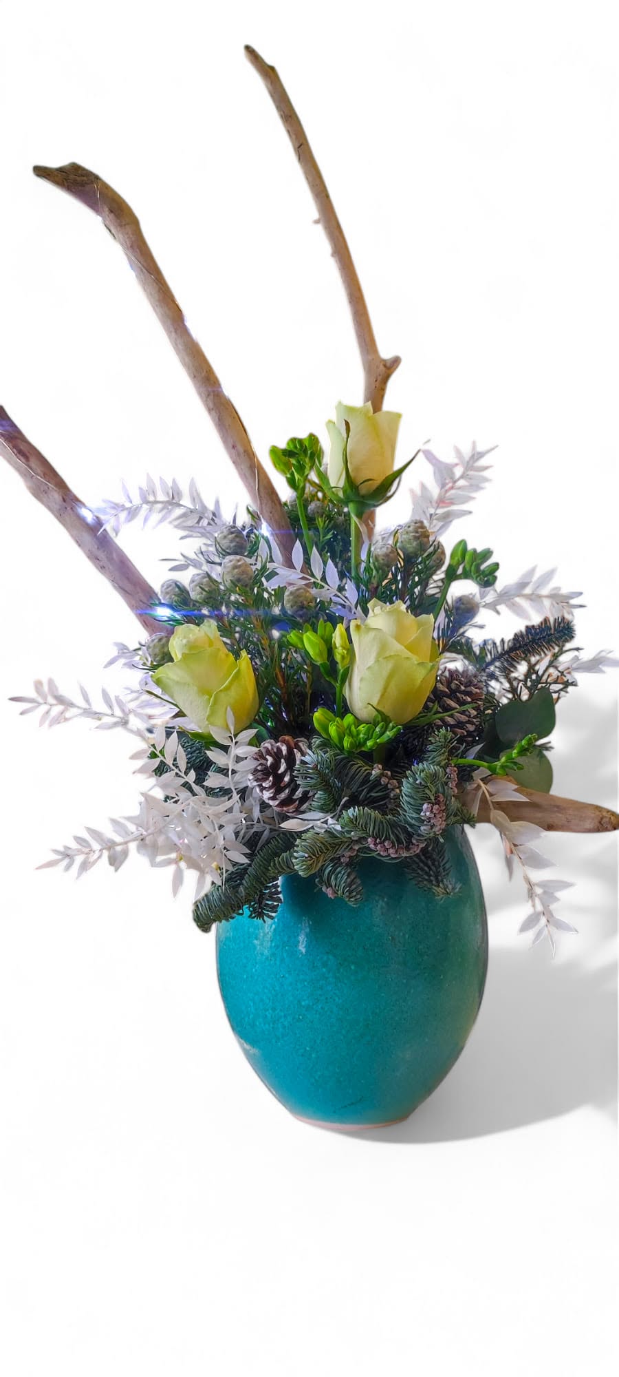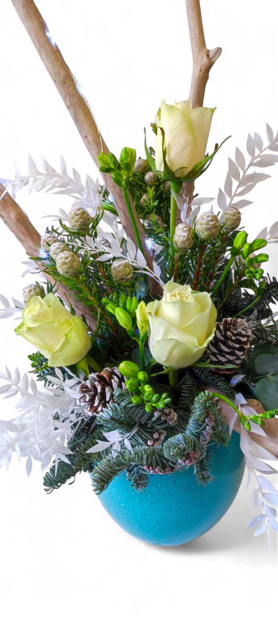 Gyönyörű téli tájra emlékeztető elő fenyős és rózsás havas hatású kézműves kerámia tál.