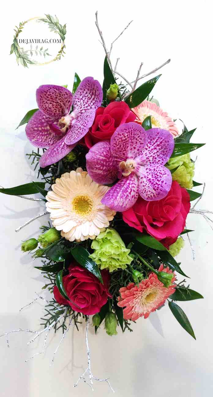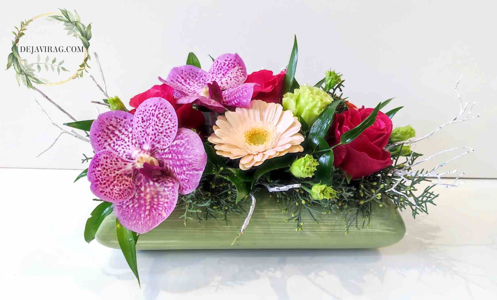 Hosszúkás kerámia mázolt tálba tűzdelt rózsák, mini gerberák, lizianthuszok és orchideák alkotta virág dísz.