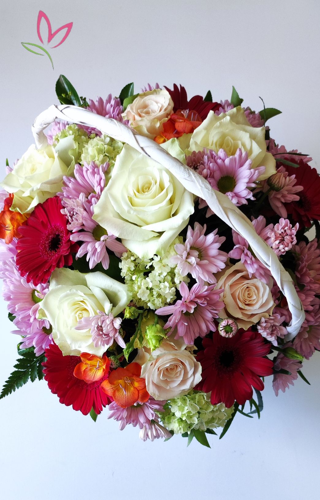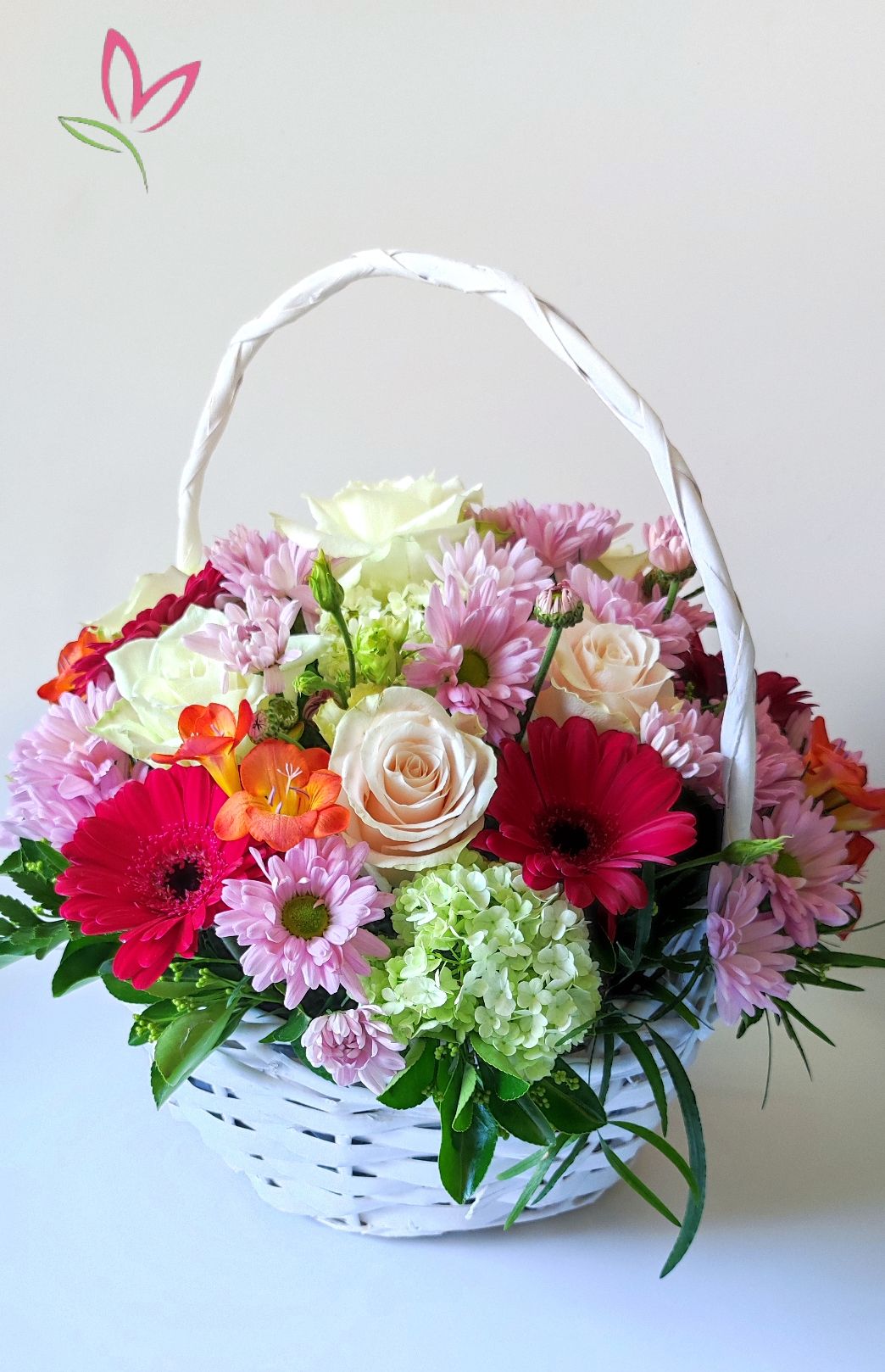 Közepes méretű fonott kosárka élő vegyes , a szezonnak megfelelő virágokkal. Mérete kb. 25x25x40 cm.